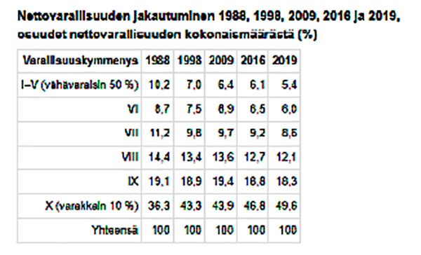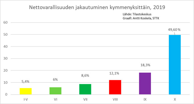 Varallisuuseroista on juuri julkaistu Tilastokeskuksen tilasto. Havainto on, että varakkaimman kymmenyksen osuus nettovarallisuudesta on viime vuosina kasvanut 47 prosentista 50 prosenttiin.