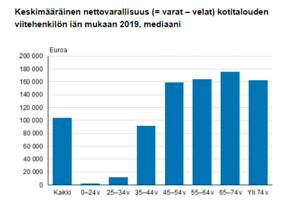 Samasta tilastosta havaitaan, että varallisuus keskittyy myös ikäryhmittäin. Alle 45-vuotiaiden nettovarallisuus on hyvin heikkoa, vaikka kolmi- ja nelikymppiset ovat jo tukevasti työssäkäyvää väkeä. Varakkaimpia ovat kuusi- ja seitsemänkymppiset.