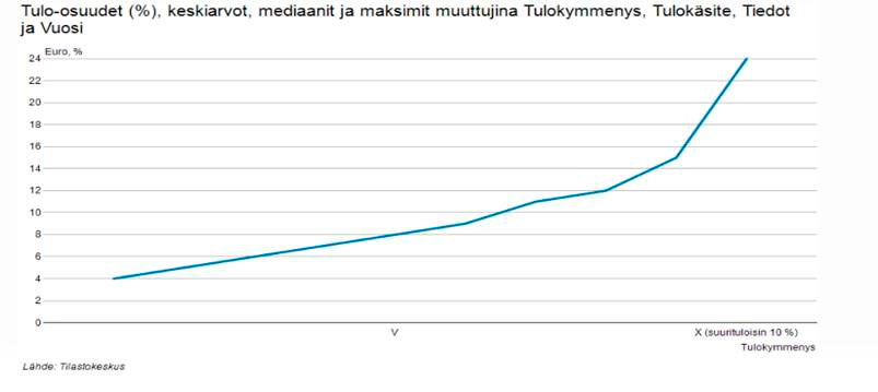 Tuloeroissa jakauma ei ole lainkaan näin jyrkkä. Suurituloisin kymmenes tienaa alle 25 prosenttia bruttotuloista (Tilastokeskus 2016).