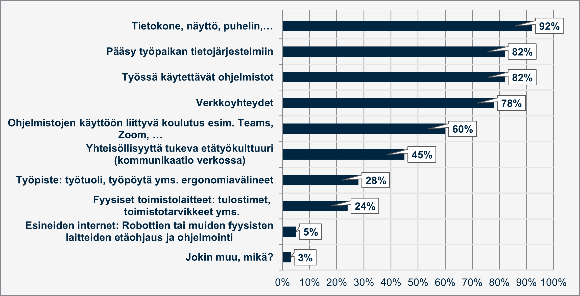 Valtaosa henkilöstön edustajista arvioi, että erilaiset etätyövälineet kuten tietokone, näyttö, puhelin, pääsy työpaikan tietojärjestelmiin, ohjelmistot ja verkkoyhteydet ovat kunnossa. Reilu puolet (60 %) kokee, että myös koulutusta ohjelmistojen käyttöön on saatu hyvin. Hienoinen enemmistö (55 %) arvioi, että työpaikan yhteisöllisyys on kärsinyt etätöistä. Suurimmat puutteet korona-ajan etätyössä liittyvät vastaajien mielestä etätyöpisteen työergonomiaan ja toimistolaitteisiin.