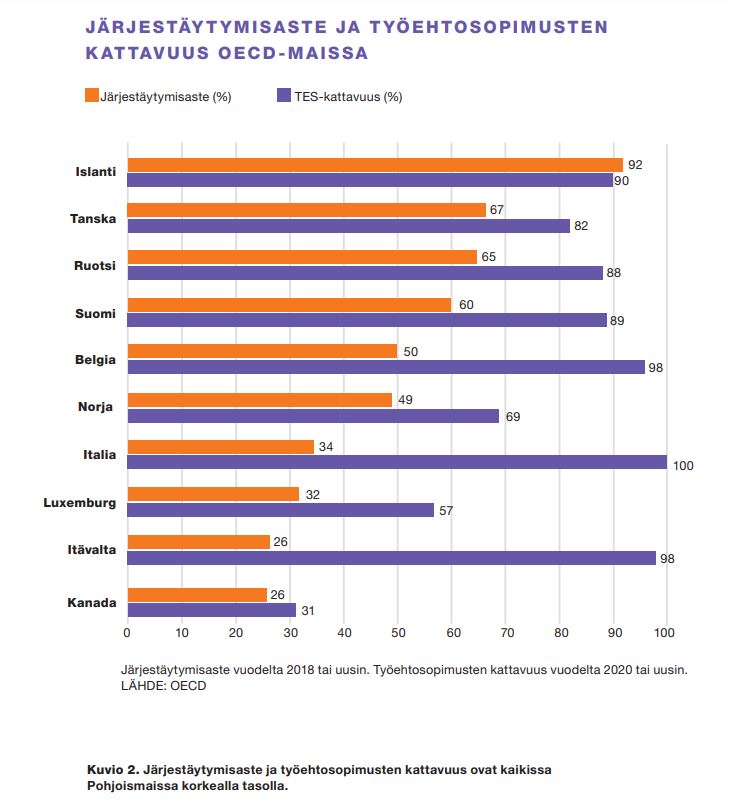 Työehtosopimusten kattavuus onkin Suomessa ja Ruotsissa hyvin samalla tasolla. Suomessa 89 prosenttia ja Ruotsissa 88 prosenttia (kuvio 2). Tanskassa ja Norjassa työehtosopimusten kattavuus on jonkin verran alempi, vaikka lakkojen määrä sama kuin Suomessa. Yleissitovuus ei siis selitä lakkoherkkyyttä millään tavalla.