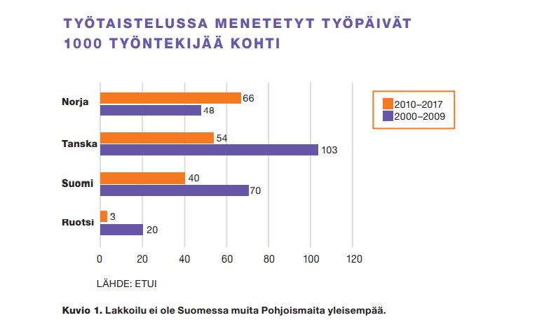 Työrauhasta puhuttaessa Ruotsi nousee usein esiin esimerkillisenä maana. Siellä on muihin Pohjoismaihin verrattuna hyvin vähän lakkoja. Suomessa lakkoillaan selvästi enemmän kuin Ruotsissa, mutta kun verrataan 2000-luvulla työtaisteluissa menetettyjen työpäivien määrää esimerkiksi Tanskaan ja Norjaan, erot eivät ole suuria (kuvio 1).