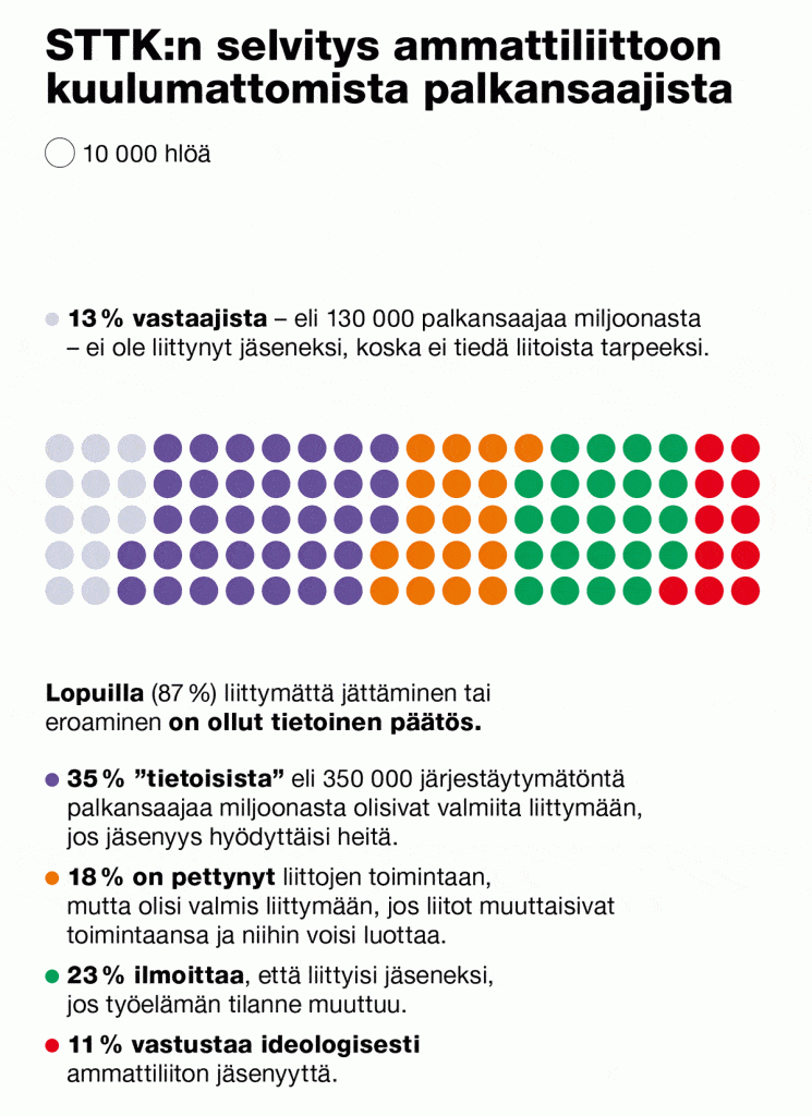 Työelämässä on miljoona palkansaajaa ilman ammattiliiton jäsenyyttä. STTK kysyi selvityksessään ei-jäseniltä, miksi he eivät ole liittyneet tai mitä pitäisi tapahtua, että he liittyisivät.