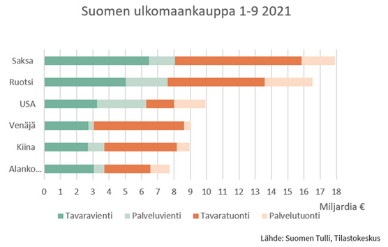 Pakotteet ja vastapakotteet osuvat Suomeenkin. Venäjä ei kuitenkaan ole enää Suomen tärkeimpiä kauppakumppaneita. Suomen vienti Venäjälle on lähes puolittunut vuosikymmenessä ja tuontikin laskenut. Nykyisin noin 5 % Suomen viennistä suuntautuu Venäjälle. Venäjä on silti Suomen neljänneksi tärkein kauppakumppanimaa.