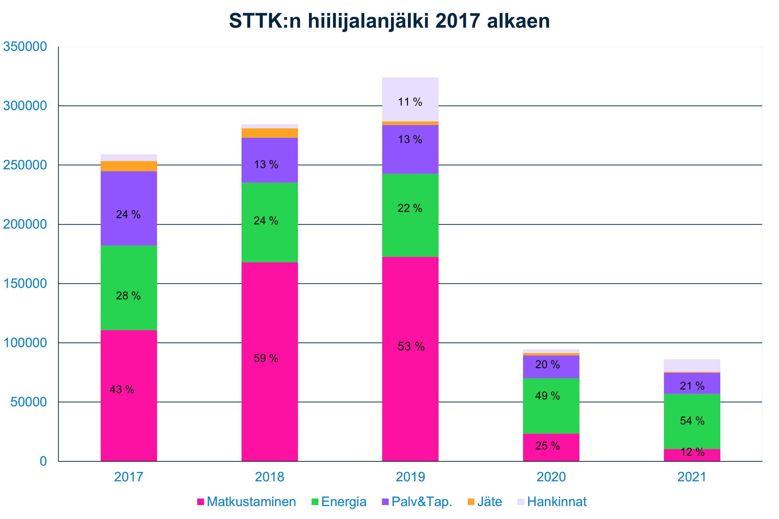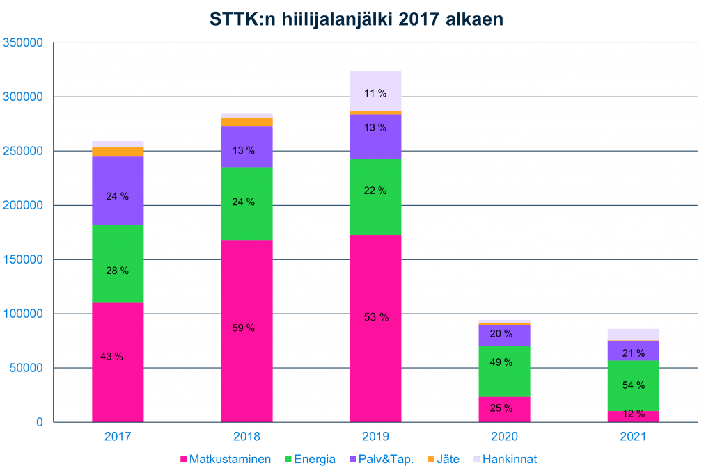 Kokonaisuutena STTK:n hiilijalanjälki putosi pandemian aikana noin kolmannekseen sitä edeltävään aikaan verrattuna. Tämän vuoden hiilijalanjälkeä ei ole vielä laskettu, mutta esimerkiksi kehittynyt etäkokouskäytäntö vähentänee matkustamista jatkossa.