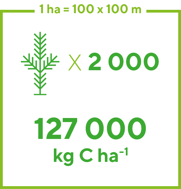 ”Yksi hehtaari: Yksi hehtaari on pinta-alayksikkö, jota käytetään usein metsäalojen esittämiseen. Yksi hehtaari on 10 000 neliömetriä eli 100 m x 100 m. Kuusen istutustiheys yhdelle hehtaarille noin 1900–2000 kpl, eli yksi hehtaari sitoo hiiltä 55 vuoden aikana noin 127 000 C kg ha-1 kivennäismaalla. Turvemaan hiilensidonta on suurempi, noin 274 000 C kg ha-1. Jotta hiilidioksidikilot saadaan hiilikiloiksi (kg CO2 / kg C), jaetaan hiilidioksidimäärä luvulla 44/12 ≈ 3.67. Männyn istutustiheys yhdelle hehtaarille on noin 2000 kpl. Eli esimerkiksi 43 männyntaimea turvetuotantoalueen metsityksessä kompensoi 43 vuodessa 10 000 kg hiilidioksidia, mikä vastaa yhden ihmisen keskimääräistä vuosittaista hiilijalanjälkeä.”