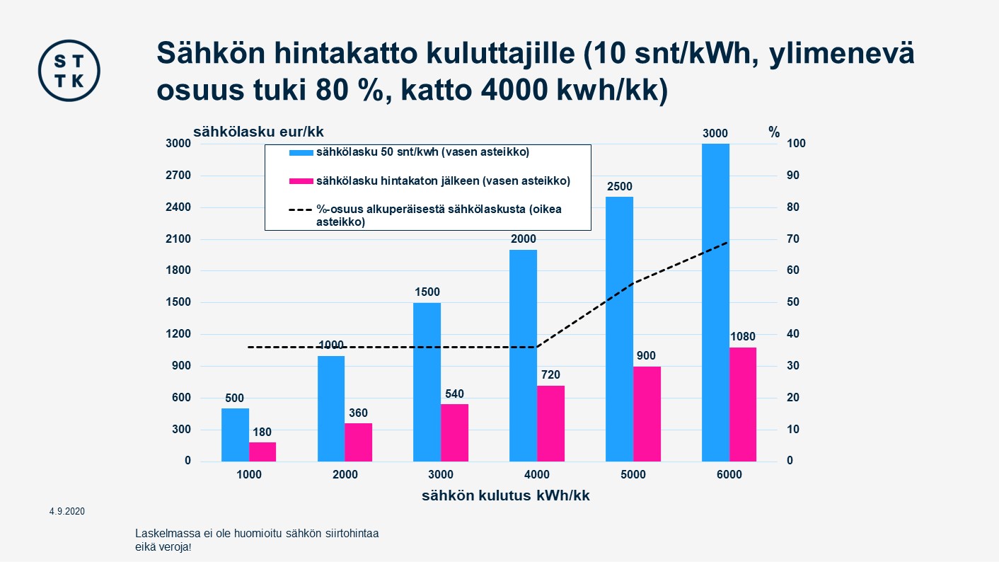 Sähkön hinnalle voitaisiin meillä asettaa esimerkiksi kymmenen sentin hintakatto, jonka ylimenevältä osalta valtio korvaisi 80 prosenttia. Sähkön kulutukselle olisi kuitenkin kuukausitasolla katto, 4 000 kWh. (ks. kuvio). Tämä malli poistaisi tarpeen erilaisille sähkötuille, koska sähkön käyttäjä maksaisi kohtuullisen hinnan käyttämästään sähköstä.