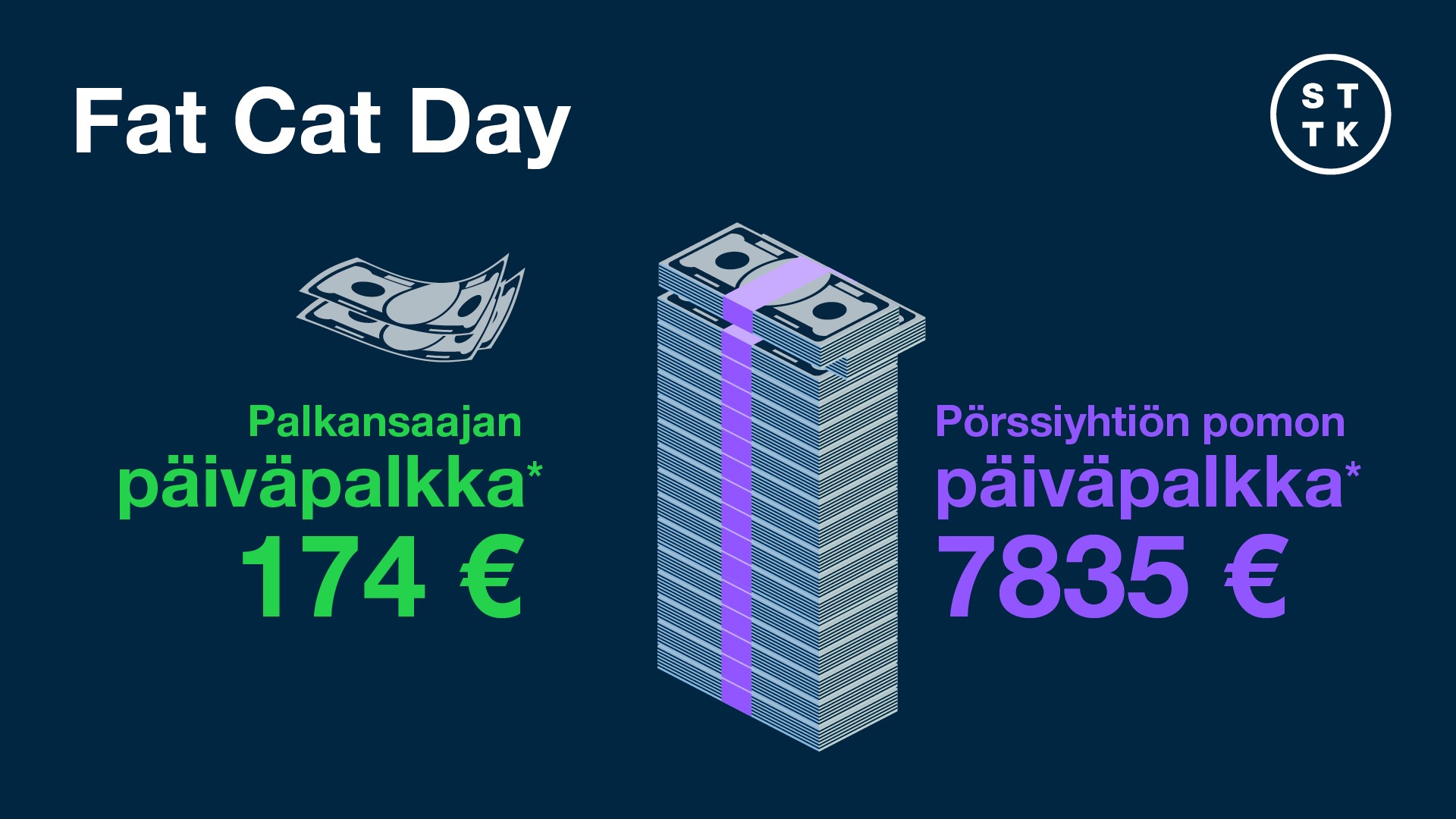 STTK on useita vuosia laskenut niin sanotun Fat Cat Day´n. Viime vuonna vastaava luku oli 37 päivää ja sitä edellisenä 39. Laskentatapaa on nyt hieman muutettu ja siksi luku ei ole täysin vertailukelpoinen aiempiin vuosiin. Aiemmin on tarkasteltu 30 suurinta pörssiyhtiötä, nyt Helsingin pörssin vaihdetuimpiin kuuluvia OMX Helsinki 25 -indeksin yhtiöitä. Laskentatapa on ennallaan: siinä huomioidaan sekä varsinaiset palkat että erilaiset palkitsemisjärjestelyt ja johtajien palkansaajaa pidempi työaika.