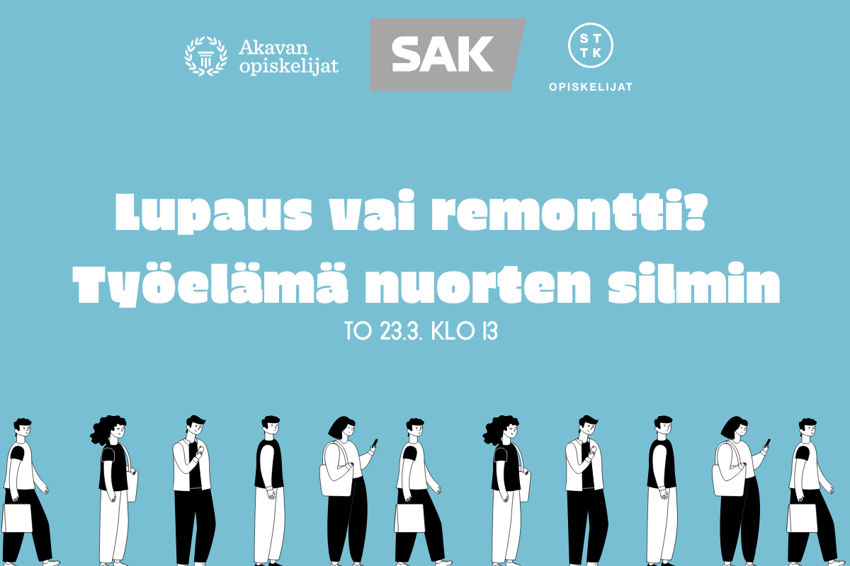 Tervetuloa seuraamaan SAK:n, Akavan Opiskelijoiden ja STTK-Opiskelijoiden järjestämää poliittisten nuorisojärjestöjen vaalipaneelia torstaina 23.3. kello 13.00 alkaen Finnkino Tennispalatsiin.