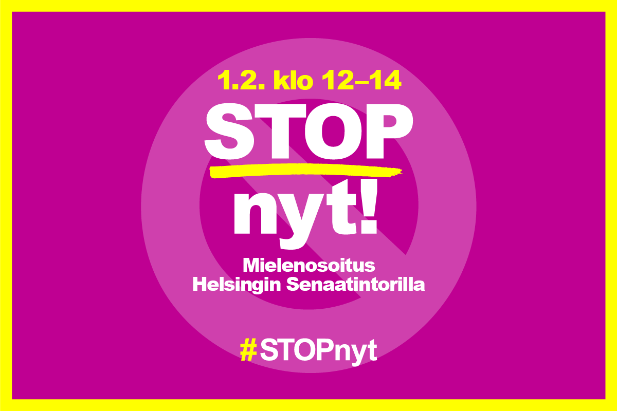 Palkansaajakeskusjärjestöt SAK ja STTK kutsuvat koolle STOP nyt! -mielenosoituksen hallituksen työelämäheikennyksiä ja sosiaaliturvan leikkauksia vastaan torstaina 1. helmikuuta. Mielenosoitus järjestetään Helsingin Senaatintorilla klo 12.00–14.00.
