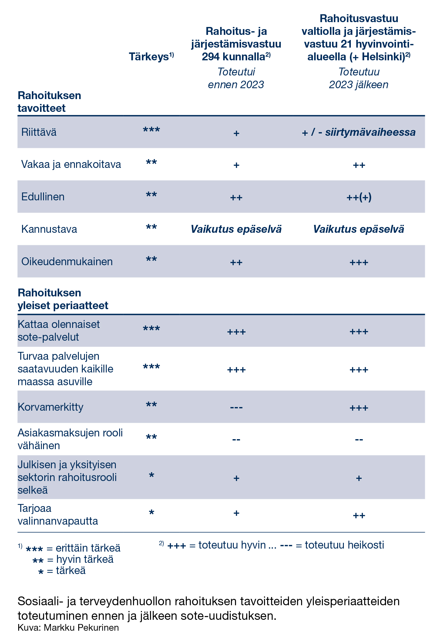 Rahoituksen ennakoitavuus ja oikeudenmukaisuus todennäköisesti paranevat aiempaan kuntapohjaiseen järjestelmään verrattuna. Veronmaksajan ja koko kansantalouden kannalta uusi järjestelmä saattaa osoittautua kustannuskehityksen hallinnan kannalta aiempaa toimivammaksi. Lopputulema riippuu siitä, miten siirtymävaiheen rahoitusongelmien ratkaisuissa onnistutaan.