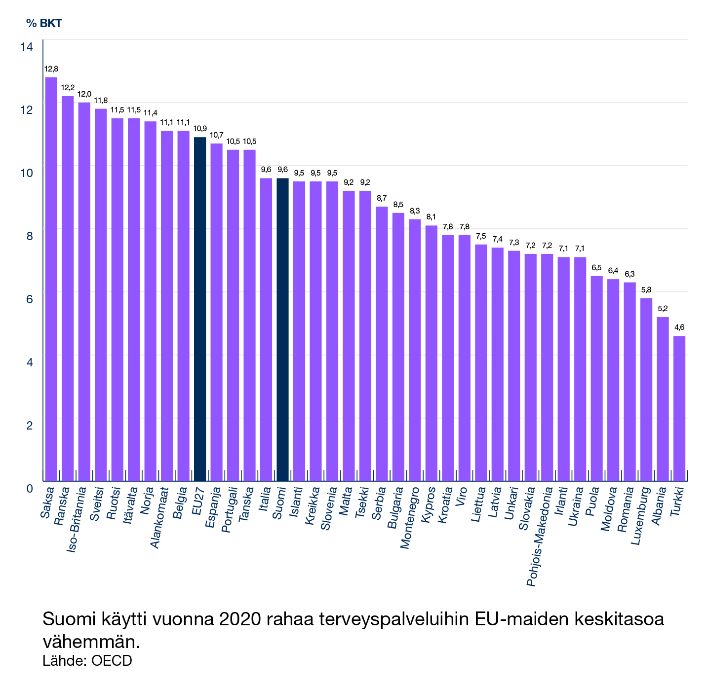 Eniten Suomi poikkeaa kaikista muista EU-maista terveysmenojen kasvun niukkuudessa. Terveysmenot asukasta kohti ovat kasvaneet Suomessa 2010-luvulla reaalisesti kaikkein vähiten EU-maista, arviolta vain noin 0,6 prosenttia vuodessa.