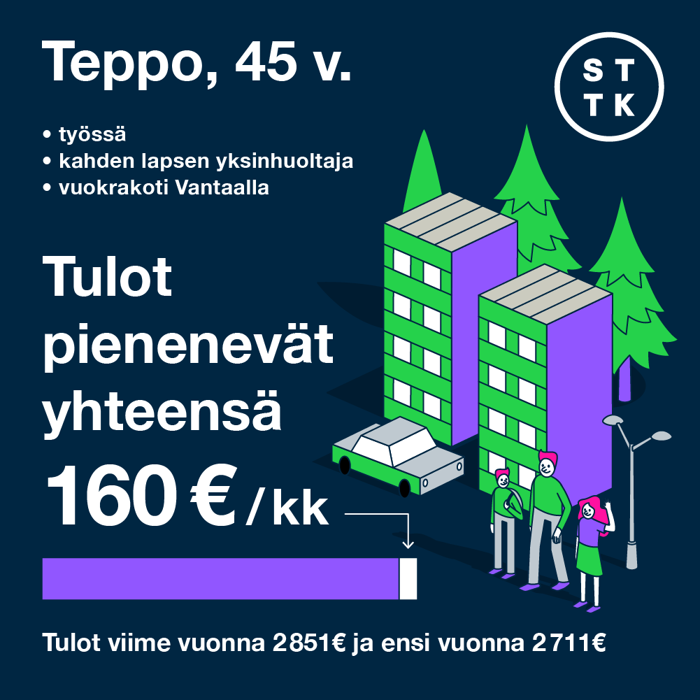 Teppo on ensihoitaja Vantaalta. Hänen palkkansa on 2 800 euroa kuukaudessa. Hän on yksinhuoltaja, jolla on kaksi alaikäistä lasta. Lapset ovat kouluikäisiä. Asunnon vuokra on 1 200 euroa kuukaudessa, asunnon koon ollessa 77 neliötä. Asumistuen leikkaus vie Tepon tuloista 188 euroa kuukaudessa. Lapsilisät nousevat 20 eurolla kuukaudessa. Ansiotulojen verotus kevenee hieman, mutta se ei riitä kompensoimaan asumistuen leikkausta. Teppo menettää 160 euroa kuukaudessa asumistuen leikkauksen takia. Käytettävissä olevat tulot alenevat 6 prosenttia.