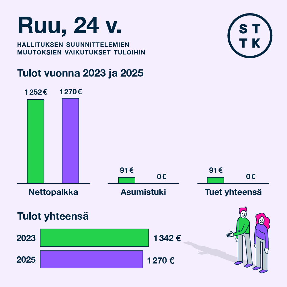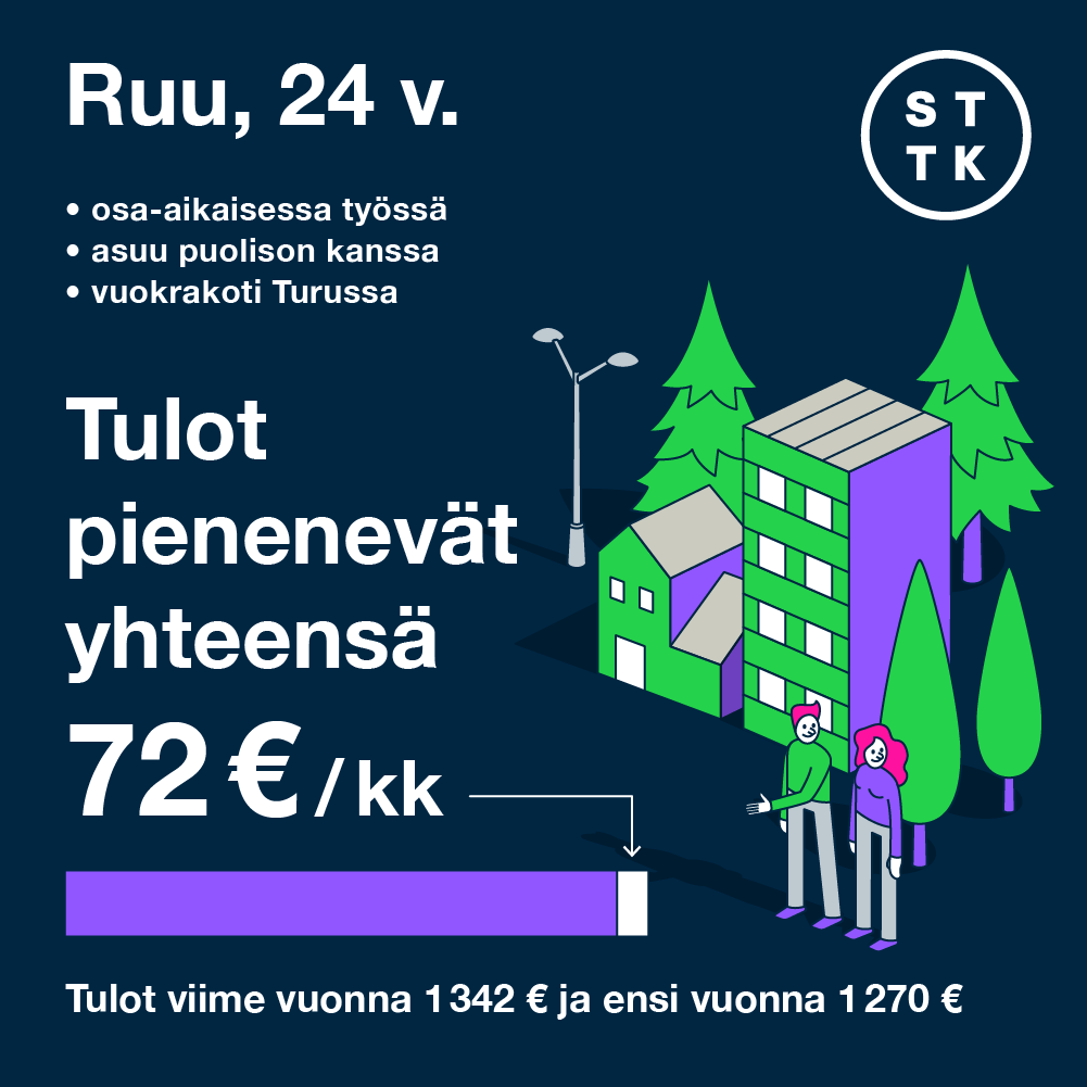 Ruu on osa-aikaisessa työssä call-centerissä. Hänen palkkansa on 1 400 euroa kuukaudessa. Hän asuu puolisonsa kanssa vuokralla Turussa vuokran ollessa tuhat euroa kuukaudessa. Asunnon koko on 60 neliötä. Pariskunnalla ei ole lapsia. Puoliso on työtön ja hän saa työmarkkinatukea 800 euroa kuukaudessa. Ansiotulojen verotus kevenee hieman. Asumistuen leikkaukset vievät kuitenkin 72 euroa kuukaudessa. Käytettävissä olevat tulot alenevat noin 5 prosenttia.