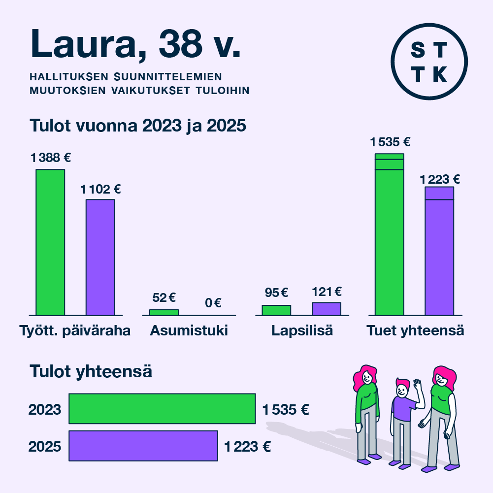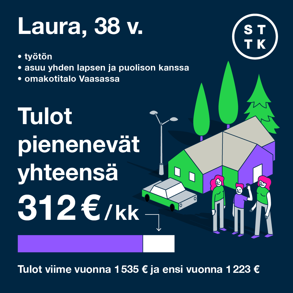 Laura asuu yhden lapsen ja avopuolison kanssa omakotitalossa Vaasassa. Hän on työtön ansiopäivärahalla. Hänen palkkansa laboranttina oli ennen työttömyyttä 2 400 euroa kuukaudessa. Myös hänen puolisonsa on työtön, joka saa työmarkkinatukea. Lapsi on alle kolmevuotias ja hän saa 26 euron korotuksen lapsilisäänsä. Ansiosidonnaisen työttömyysturvan porrastus leikkaa Lauran saamaa ansiopäivärahaa. Asumistukea ei saa enää omistusasuntoon, mikä poistaa asumistuen Lauran ja hänen avopuolisonsa kotitaloudelta. Verotus kevenee hieman, mutta ei riitä kompensoimaan työttömyysturvan ja asumistuen leikkauksia. Laura menettää 312 euroa kuukaudessa. Se on noin 23 prosentin leikkaus hänen käytettävissä oleviin tuloihinsa.