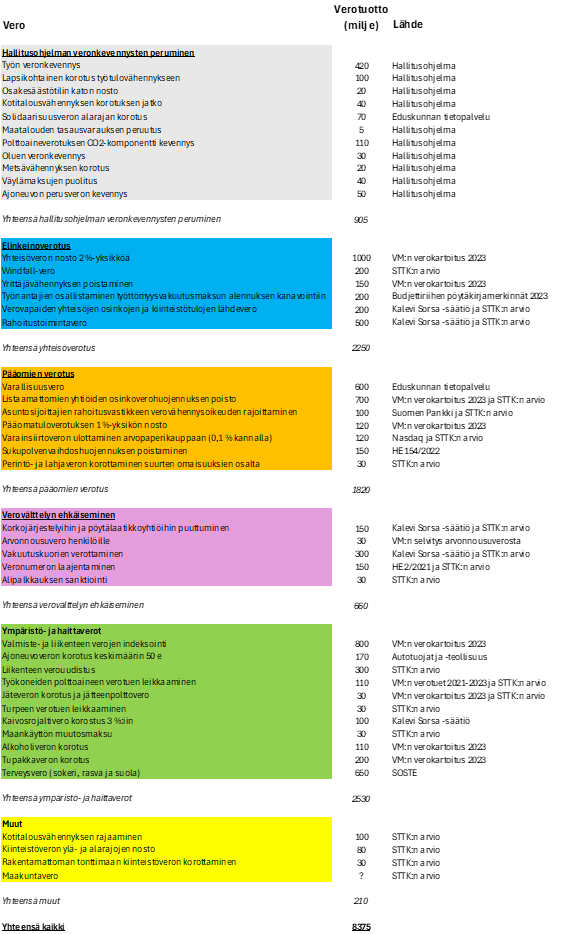 Kokonaisveroasteen alentuminen tarkoittaa kahdeksan miljardin euron verovajetta vuonna 2027. Siksi taulukon verotuotot on pyritty arvioimaan vuoden 2027 tasolla. Esimerkiksi valtiovarainministeriön verokartoituksessa verotuotot on ilmoitettu vuoden 2024 tasossa. Verotuottoarviot on muutettu vuoden 2027 tasolle hintataso ja talouskasvun vaikutukset huomioiden suhteuttamalla näiden vuosien BKT-ennusteet. Se tarkoittaa verotuottoarvioihin 12 prosentin korjausta ylöspäin.