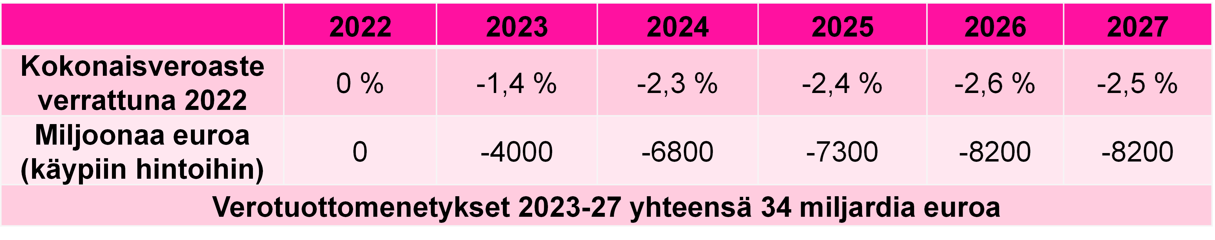 Kokonaisveroaste laskee valtiovarainministeriön ennusteen perusteella 2,5 prosenttiyksikköä hallituskauden aikana vuoteen 2022 verrattuna. Tämä tarkoittaa noin kahdeksan miljardin euron verovajetta vuonna 2027. Vuosina 2023–27 jää saamatta yhteensä 34 miljardia euroa verotuloja kokonaisveroasteen alentumisen vuoksi.