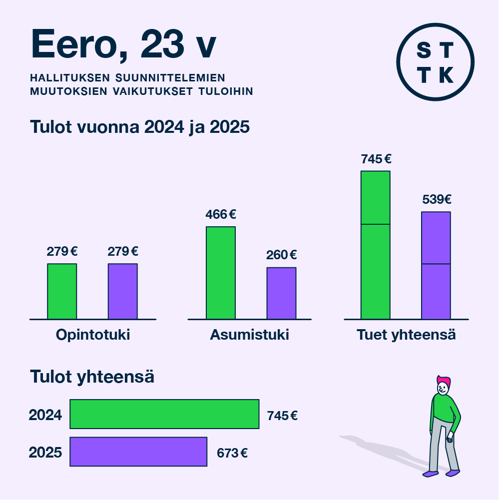 Eero opiskelee päätoimisesti kielitieteitä yliopistossa ja asuu yksin vuokra-asunnossa Helsingissä. Hänen tulonsa koostuvat opintotuesta ja asumistuesta. Tuista ei tarvitse maksaa veroa. Opiskelijana hän ei ole oikeutettu toimeentulotukeen.