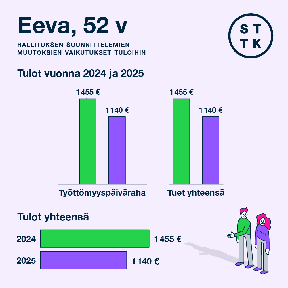 Hallitus leikkaa ansiosidonnaista työttömyysturvaa 2 kuukauden työttömyyden keston jälkeen 20 prosenttia ja 8 kuukauden jälkeen vielä 5 prosenttia. Eevan työttömyyskorvaus alenee 1237 euroon kuukaudessa. Tämä on noin 22 prosentin alennus hänen käytettävissä oleviin tuloihin.