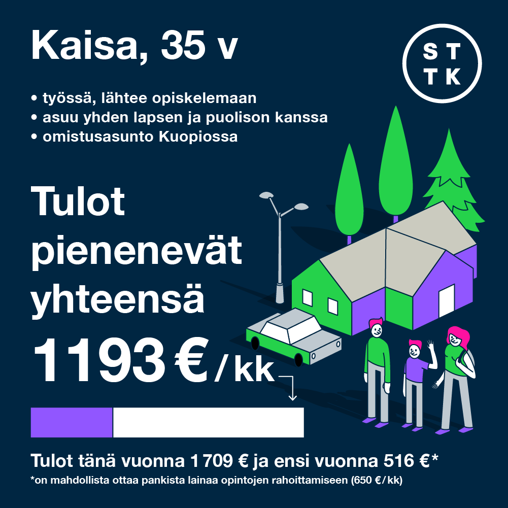 Kaisan käytettävissä olevat tulot pienenisivät 70 prosenttia aikuiskoulutustukeen verrattuna, kun huomioidaan myös verotus. Jos hän ottaisi opintolainaa maksimimäärän, käytettävissä olevat tulot pienenevät 32 prosenttia.