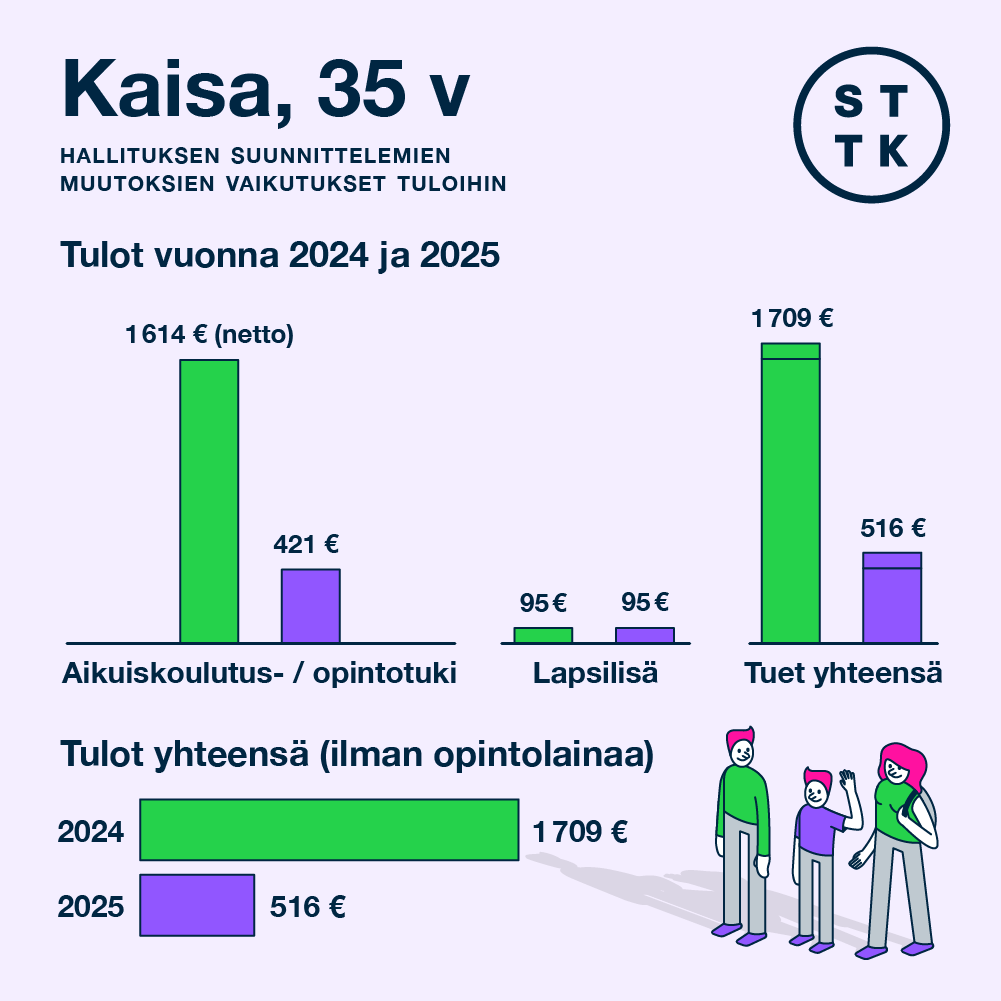 Hallitus on kuitenkin lakkauttamassa aikuiskoulutustuen osana julkisen talouden säästöohjelmaa. Koska Kaisa hakee opiskelupaikkaa vasta kevään 2024 yhteishaussa ja aloittaa opintonsa elokuussa, hän ei enää saa aikuiskoulutustukea. Kaisan on haettava opintorahaa, jonka suuruus olisi hänen tapauksessaan 421 euroa kuukaudessa. Puolison palkka on 3000 euroa kuukaudessa, joten he eivät saa asumistukea.