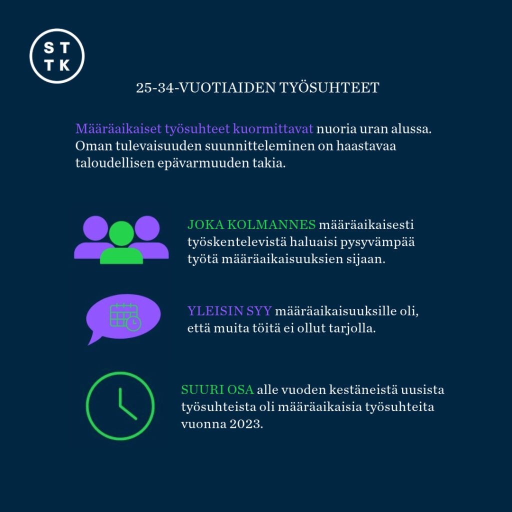 Jopa joka kolmannes 25-34-vuotiaista määräaikaisista työntekijöistä haluaisi pysyvämpää työtä. Lähde: Tilastokeskus