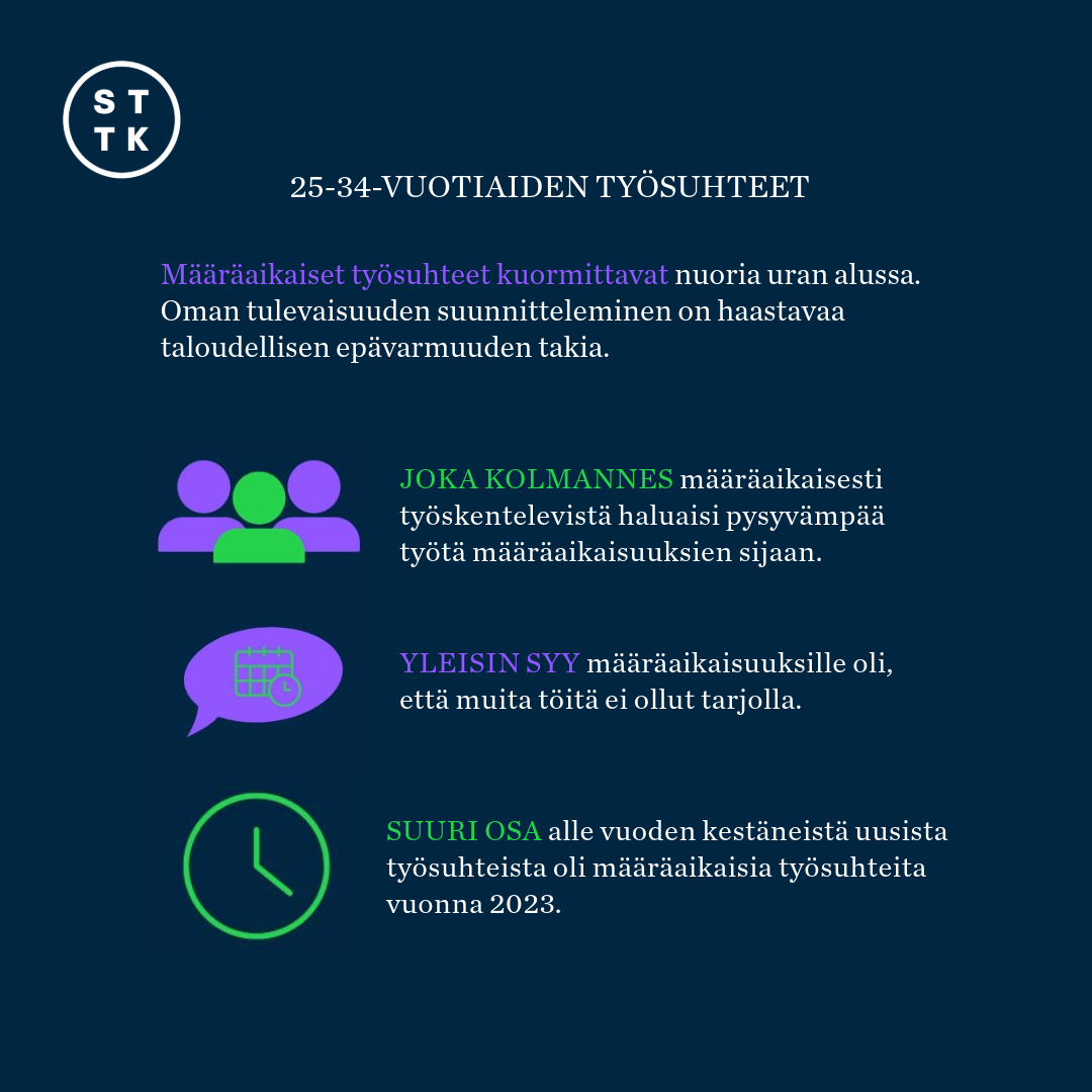 Tilastokeskuksen mukaan pysyvää työtä on vähiten tarjolla 25-34-vuotiaille, ja jopa kolmasosa määräaikaisesti työskentelevistä tässä ikäryhmässä haluaisi pysyvän työn.