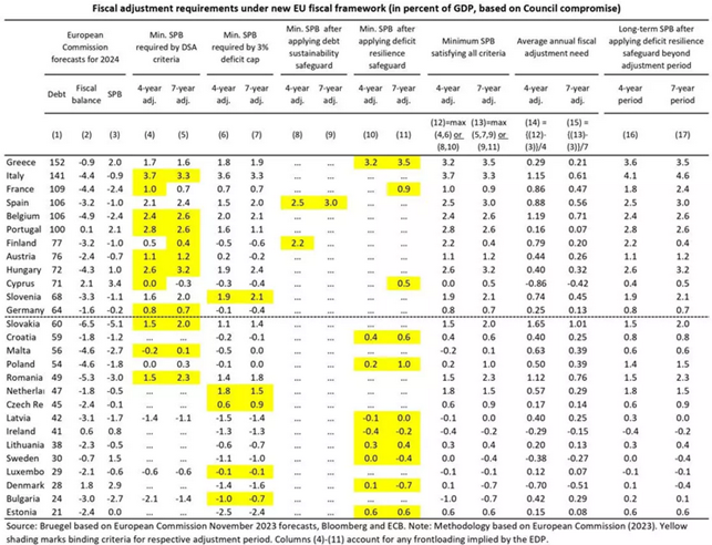 Harmittavasti EU:n finanssipolitiikan uusista säännöistä ei juuri ole vaikutusarvioita julkaistu. Bruegel on kuitenkin laskenut, mikä kriteeri sitoisi kutakin jäsenmaata ja kuinka paljon sopeutusta vaadittaisiin vuosittain (ks. taulukko alla). Keltaisella on korostettu sitovaa kriteeriä. Laskelma perustuu EU:n talous- ja rahoitusasioiden neuvoston (ECOFIN) joulukuiseen kompromissiin, jonka jälkeen sääntöihin on tullut vain pieniä muutoksia.