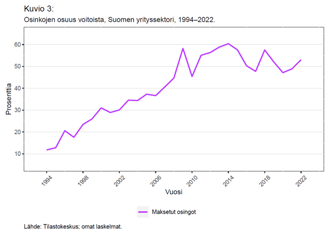 Kuviosta 3 nähdään, että osinkojen osuus voitoista – eli yrittäjätuloista – on kasvanut merkittävästi yrityssektorilla viimeisen kolmen vuosikymmenen aikana. 1970–1980-luvuilla osinkojen osuus voitoista oli keskimäärin kymmenen prosenttia yrityssektorilla, mutta vuonna 2022 osinkoja maksettiin peräti 53 prosenttia voitoista. Maksettujen osinkojen määrä kasvoi yli tuhat prosenttia (22 mrd. €) vuosina 1989–2022. Osinkojen kasvu on vähentänyt sitä osaa voitoista, jonka yritykset joko säästävät tai investoivat.