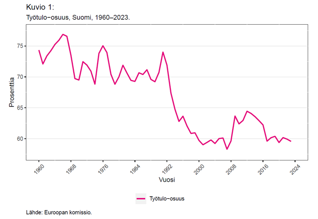 Kuviosta 1 nähdään, että Suomen työtulo-osuuden tasossa tapahtui rakenteellinen muutos 1990-luvun laman aikana. 1960–1980-luvuilla työtulo-osuus oli keskimäärin noin 72 prosenttia, mutta 1990-luvulta lähtien osuus on ollut keskimäärin kymmenen prosenttiyksikköä matalampi. Toisin sanoen: Kymmenen prosenttiyksikköä BKT:sta on siirtynyt palkansaajilta pääomatulojen saajille.