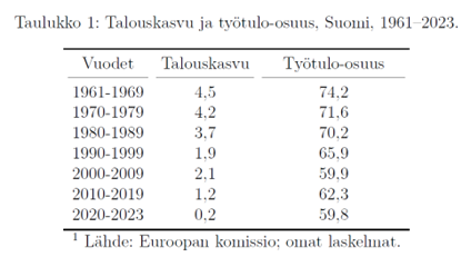 Taulukko 1 esittää talouskasvun ja työtulo-osuuden keskiarvoja vuosikymmenittäin vuodesta 1961. Siitä nähdään, että talouskasvu on hidastunut samalla, kun työtulo-osuus on laskenut. Koska kyse voi kuitenkin olla satunnaisesta korrelaatiosta, asiaa on syytä tarkastella lähemmin.