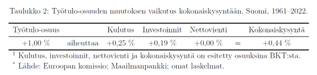 Taulukkoon 2 kirjatut tulokset näyttävät, että Suomessa prosentin lisäys työtulo-osuudessa lisää kulutusta 0,25 prosenttia ja investointeja 0,19 prosenttia. Sen sijaan työtulo-osuudella ei ole merkittävää vaikutusta nettovientiin. Kun nämä vaikutukset summataan, nähdään, että prosentin lisäys työtulo-osuudessa lisää kokonaiskysyntää 0,44 prosentilla Suomessa.