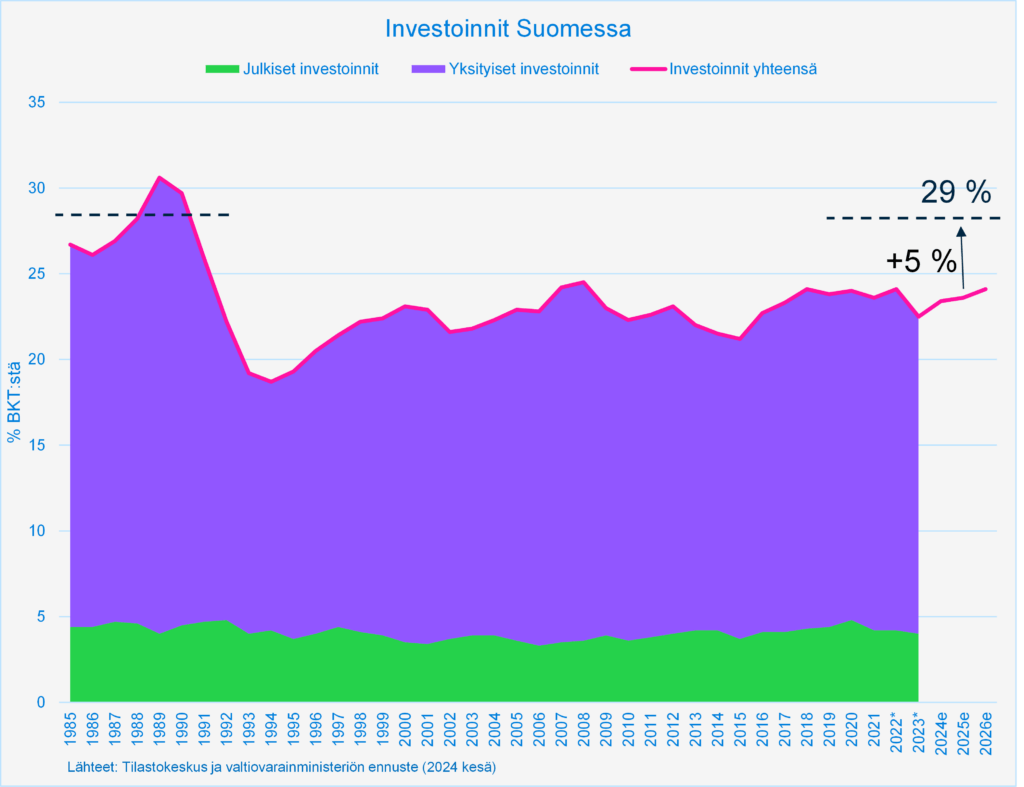 Esimerkiksi Suomessa yksityiset investoinnit ovat noin 19 prosenttia BKT:stä ja julkiset investoinnit vajaa viisi (ks. kuvio). Jos tavoite nostaa investointeja vajaalla viidellä prosenttiyksiköllä saavutettaisiin ainoastaan julkisilla investoinneilla, se tarkoittaisi niiden kaksinkertaistamista.