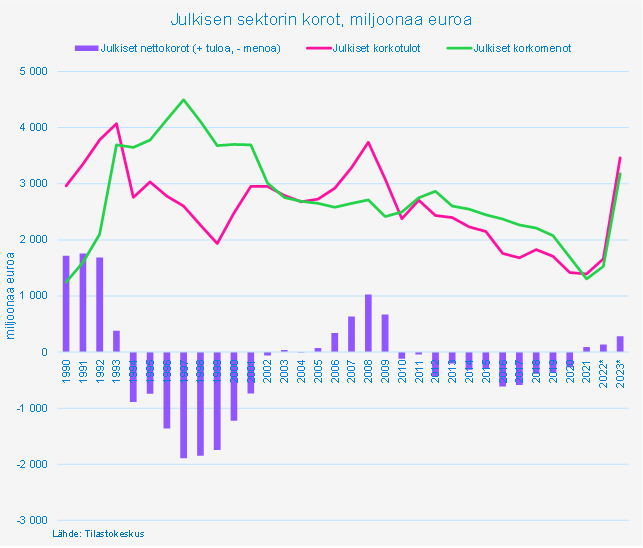 Talouspolitiikan arviointineuvosto huomautti muistiossaan jo vuonna 2019, että korkotason lasku heikentää julkista taloutta, sillä julkisella sektorilla on huomattavasti rahoitusvarallisuutta. Tällöin elettiin vielä nollakorkojen aikaa. Loogisesti tämä tarkoittaa, että korkotason nousu nyt vahvistaa julkista taloutta. Alla olevan kuvion perusteella näin näyttää todella käyneen, sillä julkiset korkotulot ovat kasvaneet korkomenoja nopeammin. Julkisella sektorilla oli noin 300 miljoonan euron verran enemmän korkotuloja kuin korkomenoja vuonna 2023.