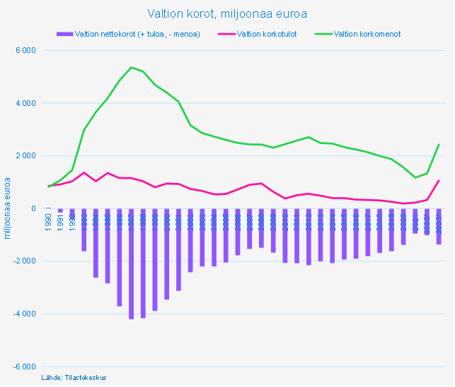 Korkomenojen nousua pidetään keskeisenä tekijänä julkiseen tai ainakin valtion velkaantumiseen. Esimerkiksi syksyn budjettiriihessä hallitus esitti korkomenojen noususta johtuvan valtion alijäämän olevan 1,8 miljardia euroa ensi vuonna verrattuna vuoteen 2019. Asia on näin, jos tarkastellaan ainoastaan korkomenoja. Tasapainoisemman kuvan kehityksestä kuitenkin saa, jos tarkastelee samalla korkotulojen kasvua. Korkotasolla on vaikutus molempiin tekijöihin.