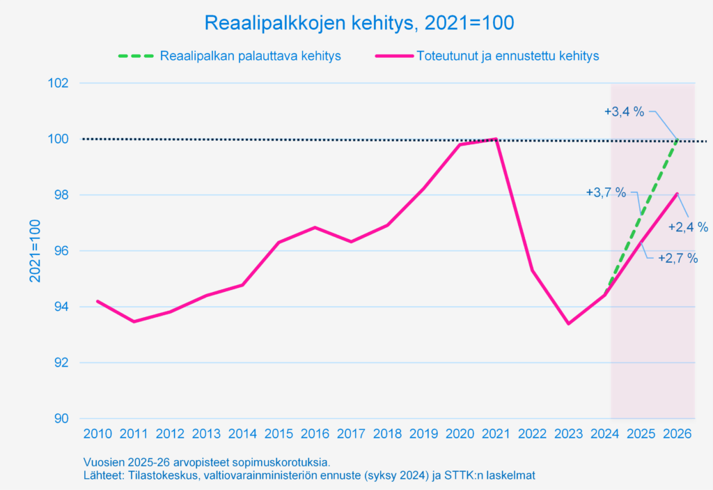 Jotta reaalipalkat saavuttaisivat vuoden 2021 tason vuonna 2026, tarvittaisiin noin prosentin korkeammat sopimuskorotukset vuosina 2025–2026, kuten alla olevassa kuviossa on ennustettu. Valtiovarainministeriö ennustaa sopimuskorotuksiksi 2,7 prosenttia ensi vuonna ja 2,4 vuonna 2026. Jos palkkaliukumat ja inflaatio pysyvät muuttumattomina, 3,7 prosentin sopimuskorotus ensi vuonna ja 3,4 korotus vuonna 2026 riittäisivät kuromaan palkkamontun umpeen.