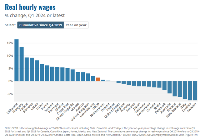 Onko matalampi inflaatio riittänyt kompensoimaan hitaamman palkkakehityksen? Ikävä kyllä ei. Suomalaisten reaalipalkat ovat jääneet jälkeen monista muista maista. Alla olevassa kuviossa on esitetty reaalisen tuntipalkan kehitys OECD-maissa vuoden 2019 lopusta vuoden 2024 alkuun. Suomessa reaalipalkka on pudonnut viidenneksi eniten. Ruotsissa reaalipalkan kehitys on ollut kaikkein huonointa.