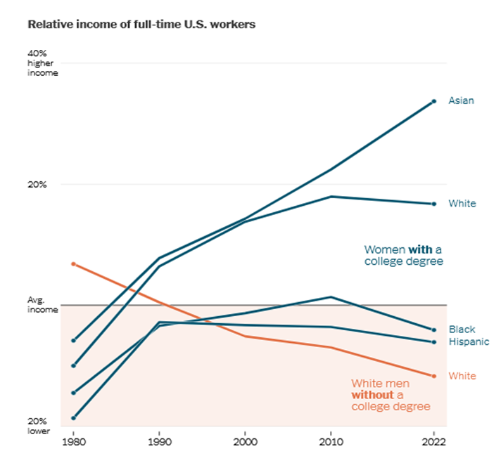 Amerikkalaisessa keskustelussa yleisesti katsotaan valkoisen työväenluokan menettäneen suhteellisesti sosiaalisen asemansa ja samalla luottamuksen yhteiskuntaan. Etenkin heidän työmarkkina-asemansa on heikentynyt selvästi. Palkkatason nousu ei ole pysynyt vakuutus-, asumis- tai koulutuskustannusten nousun tahdissa. Samalla esimerkiksi maan aasialaistaustaiset ovat parantaneet taloudellista asemaansa selvästi.