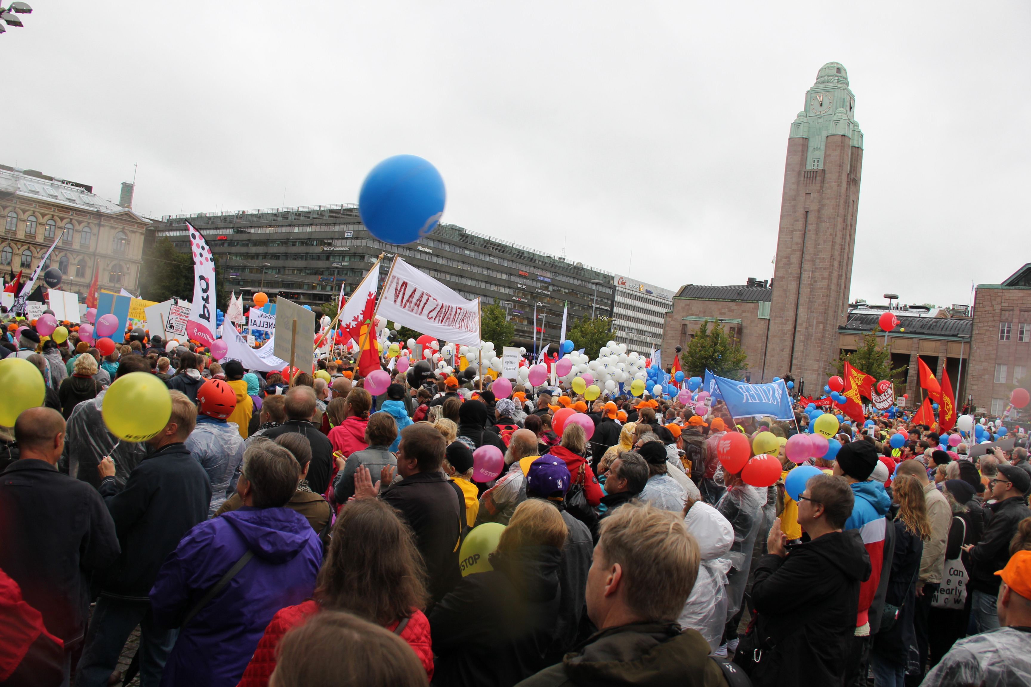 The demonstration organised by the three trade union confederations brought 30,000 people to Helsinki in spite of heavy rain. The main message was to defend the unions’ rights with regard to free collective bargaining and protest against austerity measures planned by the Government. In tandem with the demonstration on Friday 18 September public transport, trains, harbours and air traffic ground to a halt. Quite a number of shops, offices, day-care centres and many factories including paper mills also shut down. The total number of people who came out in protest against the Government measures was 300,000 around the country. The Government is planning to limit and cut by law the extra pay for week-end and night work. These cuts will hit low paid women especially hard.