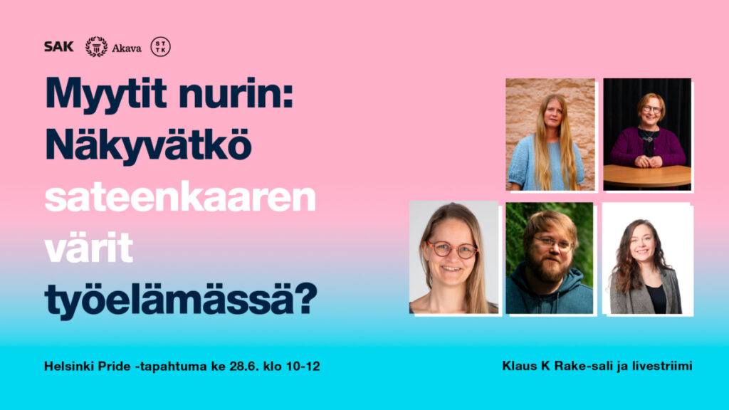 SAK:n, Akavan ja STTK:n yhteisessä kaikille avoimessa työelämäseminaarissa etsitään vastauksia muun muassa siihen, voiko työpaikalla tapahtuvaan syrjintään puuttua tehokkaasti ja onko sateenkaariperheillä samanlaiset oikeudet työelämässä kuin muilla perheillä.