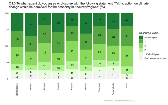 Också när man frågade om åtgärderna mot klimatförändringen medför ekonomisk nytta skiljde sig finländarnas åsikter från den övriga nordiska befolkningens. Av finländarna ansåg 46 procent att åtgärderna mot klimatförändringen medför ekonomiska fördelar för samhällsekonomin i det egna landet. Motsvarande siffra var 61 procent i Island, 58 procent i Danmark och 56 procent i Sverige. I Norge, som är en stor oljeproducent, var siffran 42 procent.
