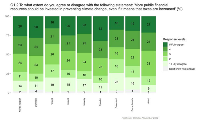 När de fick frågan om mer offentliga medel borde satsas på att bekämpa klimatförändringen, även om det skulle innebära skattehöjningar, var andelen av de svarande som skulle vara beredd att göra det 55 procent i Sverige, 52 procent i Danmark, 48 procent i Norge, 46 procent i Island och bara 37 procent i Finland.